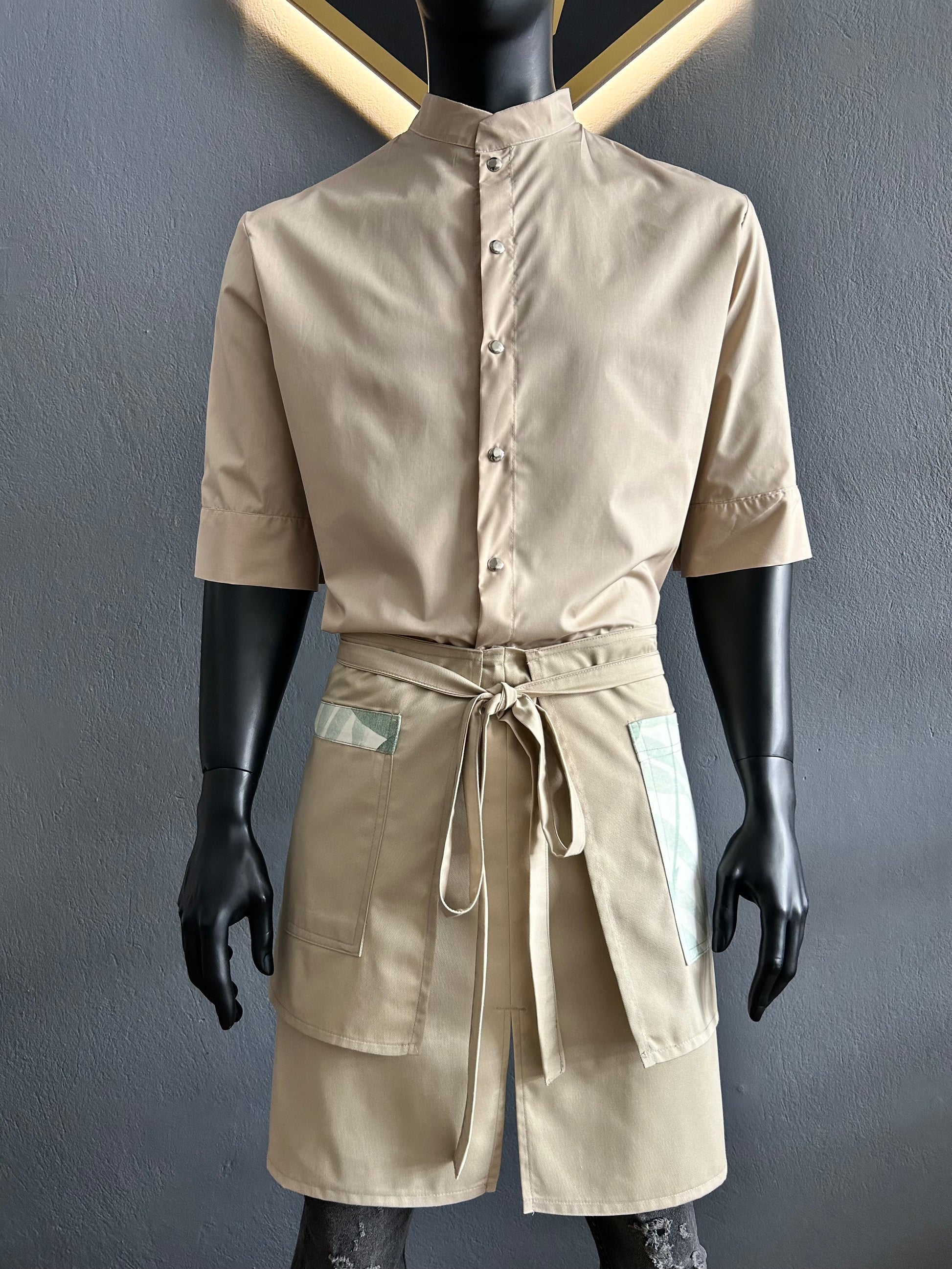 The Hanami Apron is inspired by the timeless elegance of the samurai uniform, combined with the delicate beauty of nature. Its beige base fabric represents strength and endurance, while the subtle floral details add a refined and sophisticated character.