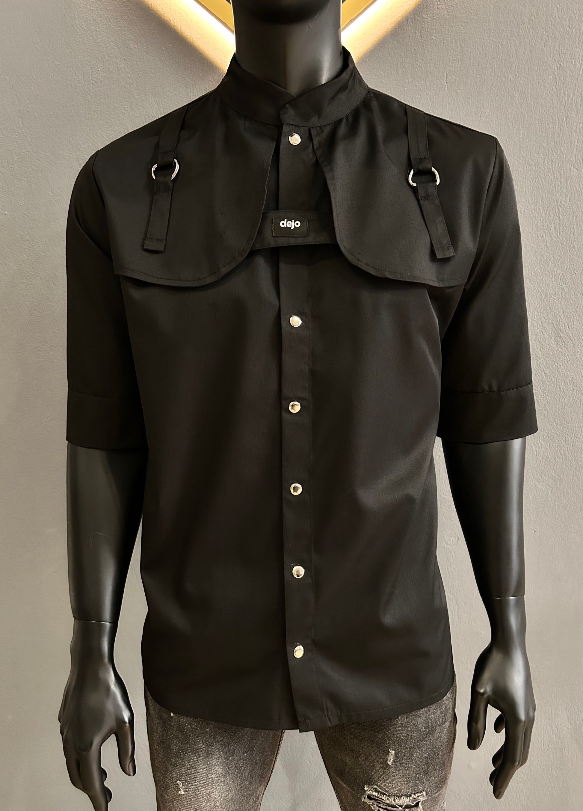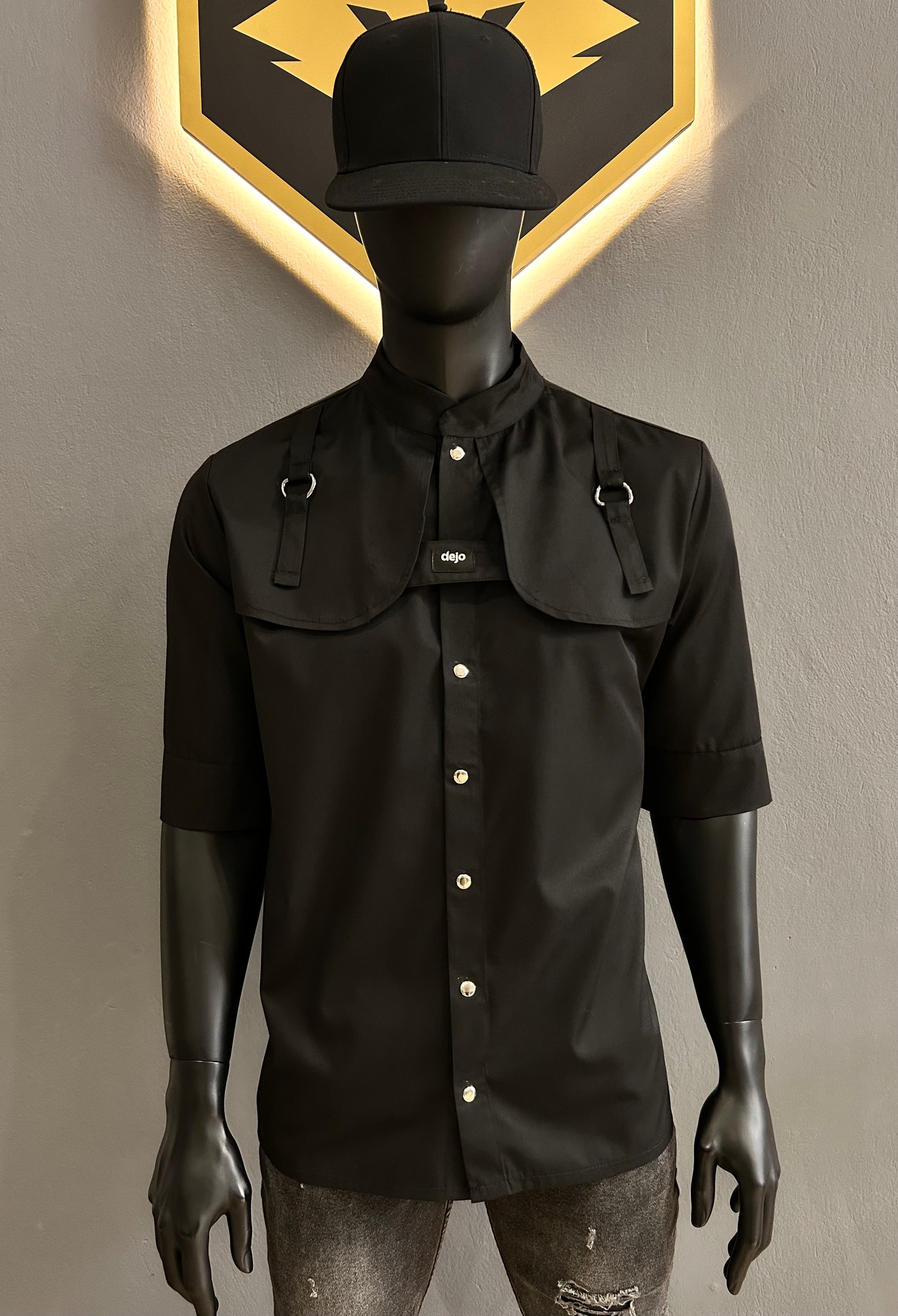 The bold double flaps across the chest create a structured, armored look, while the twin shoulder straps with metal D-rings amplify its warrior-inspired presence. The clean lines of the Mandarin-style collar and the precise cut of the short sleeves highlight a modern yet timeless silhouette.