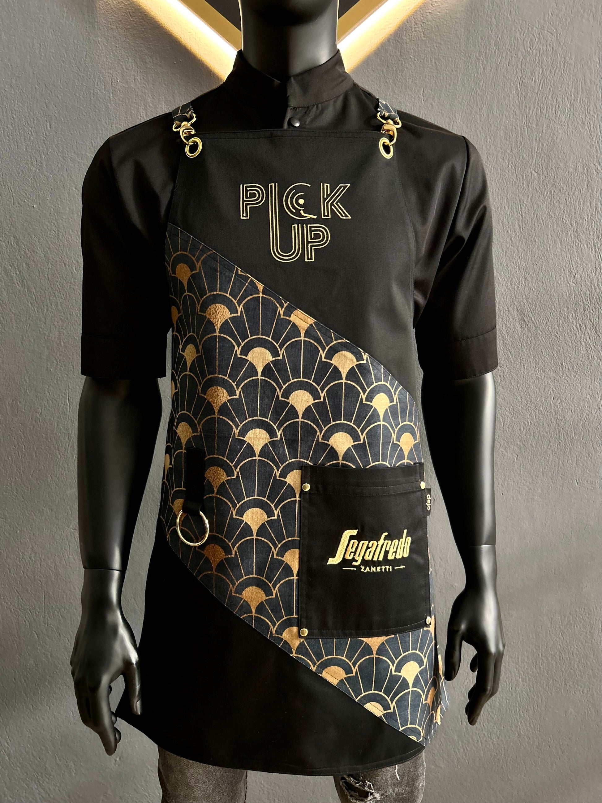 Crafted from a strong and durable black fabric (65% cotton – 35% polyester), it offers both resilience and comfort for daily professional use. The stain-resistant geometric fabric with golden details adds a bold, luxurious character, turning this apron into a true statement piece of sophistication and style.