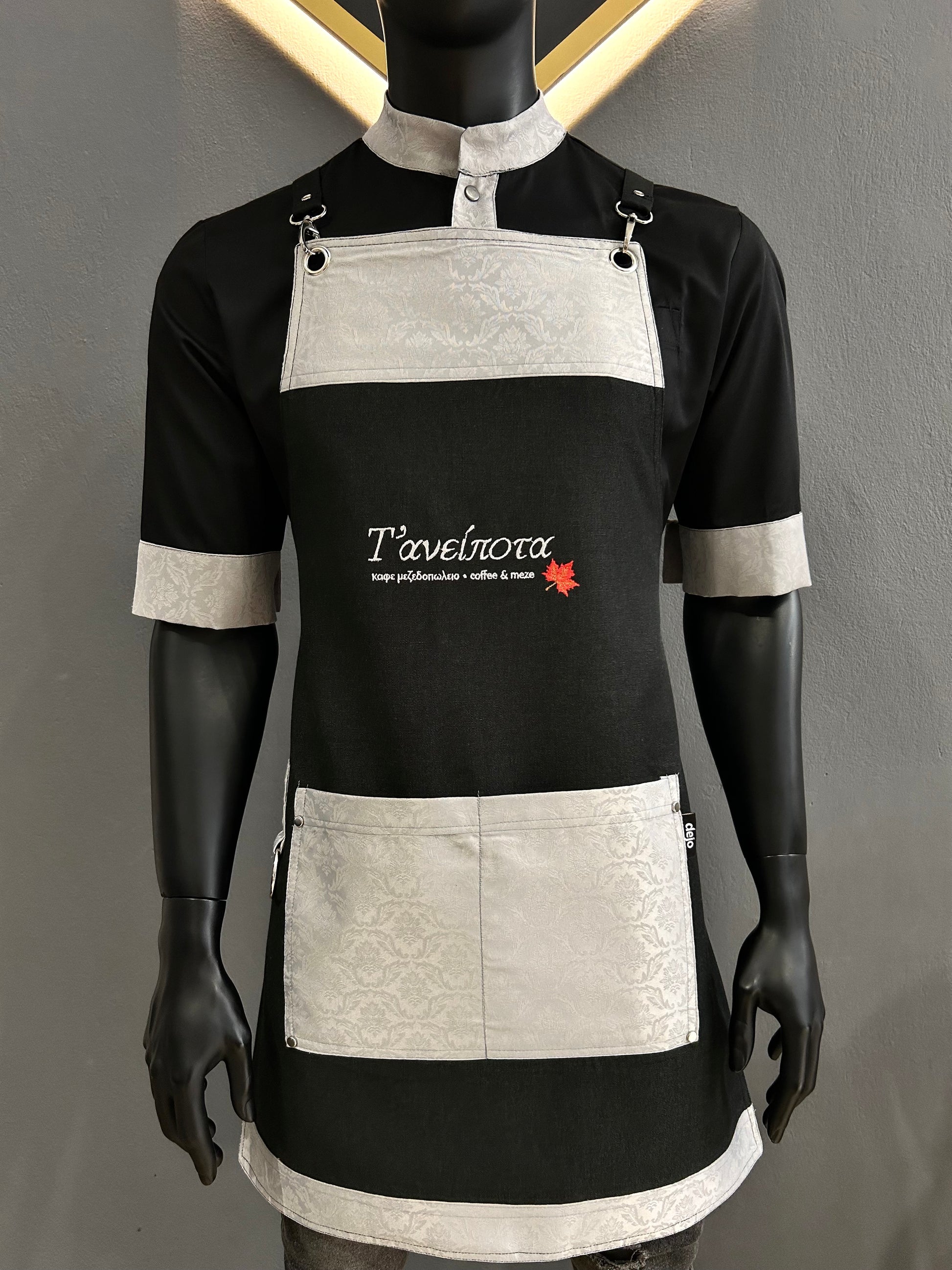 Crafted from a premium dark charcoal grey waterproof fabric, it ensures durability and protection for everyday professional use. The silver-grey details with embossed geometrical patterns add a subtle artistic character, elevating the apron into a unique statement of modern sophistication.