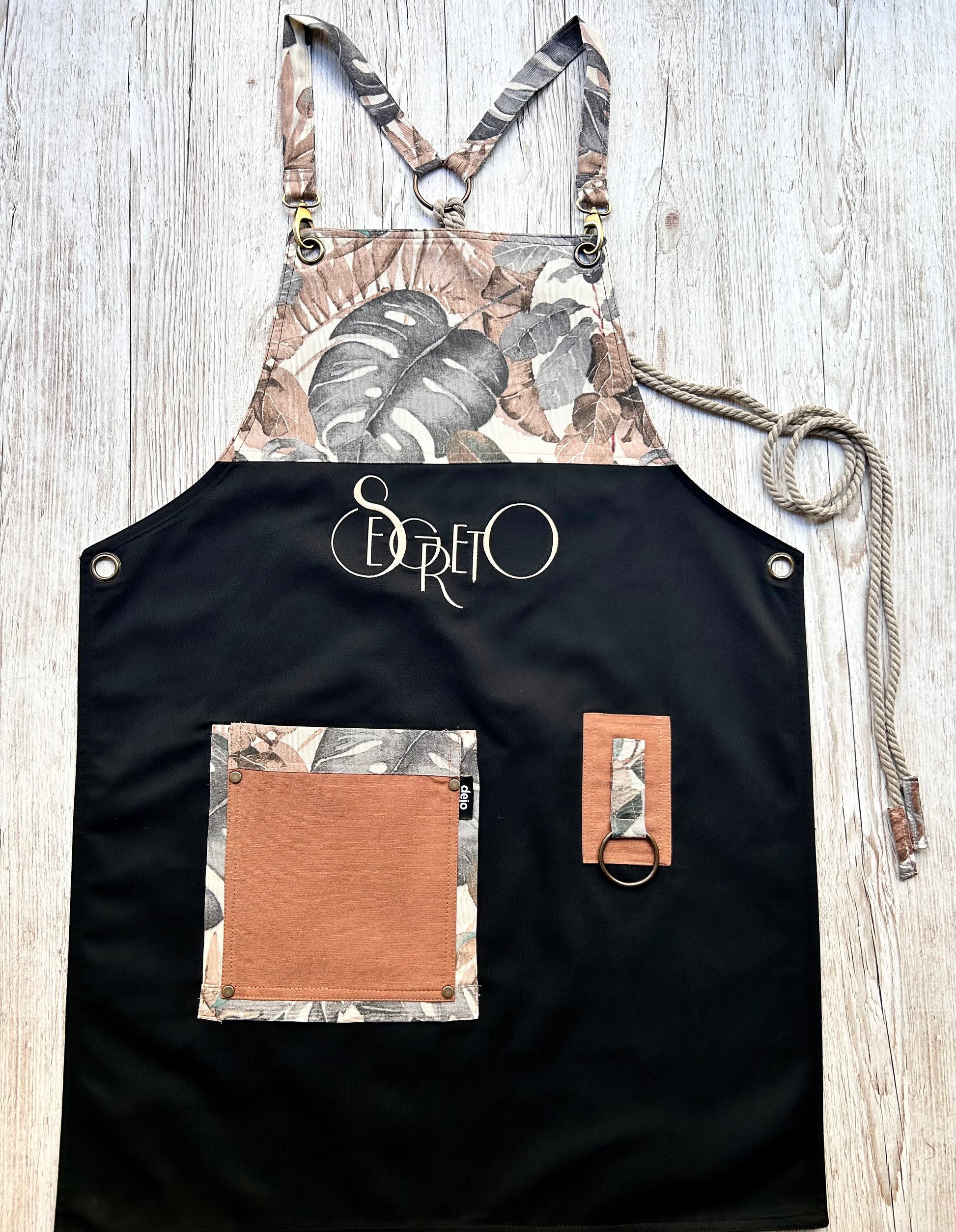Crafted from durable German black fabric (65% cotton – 35% polyester), it ensures resilience, comfort, and longevity in daily professional use. The autumn-themed digital print fabric with bold Monstera leaves, combined with terracotta accents, adds warmth and sophistication, making this apron a unique statement of natural elegance.