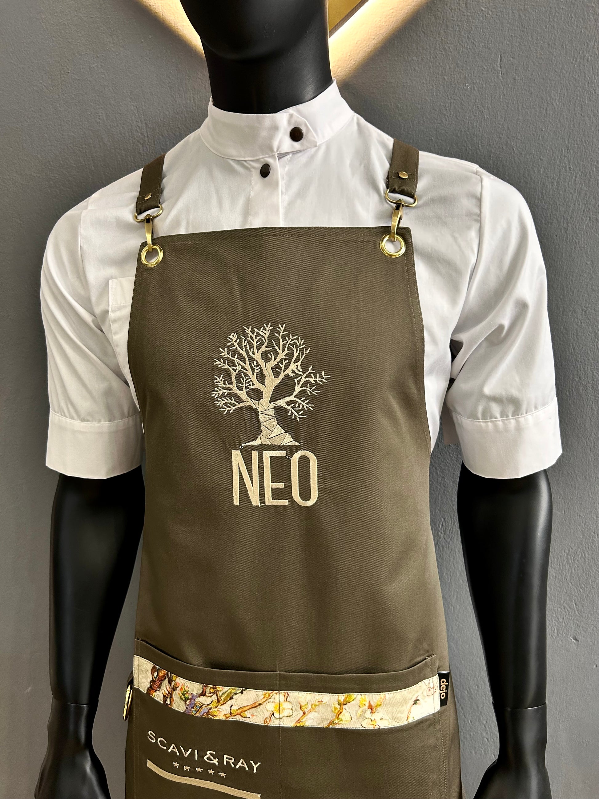 Crafted from a strong and resistant olive khaki fabric (65% cotton – 35% polyester), it offers durability for daily professional use, while the subtle beige detail with an almond tree motif adds a touch of refined artistry.