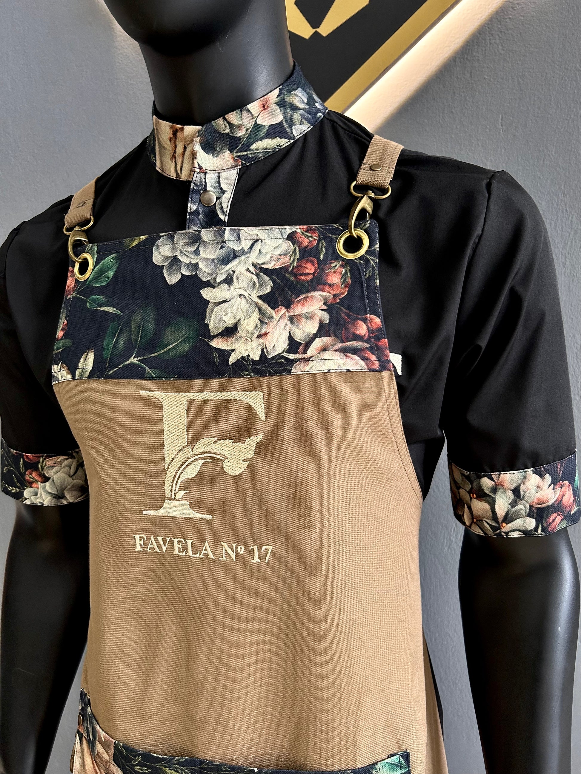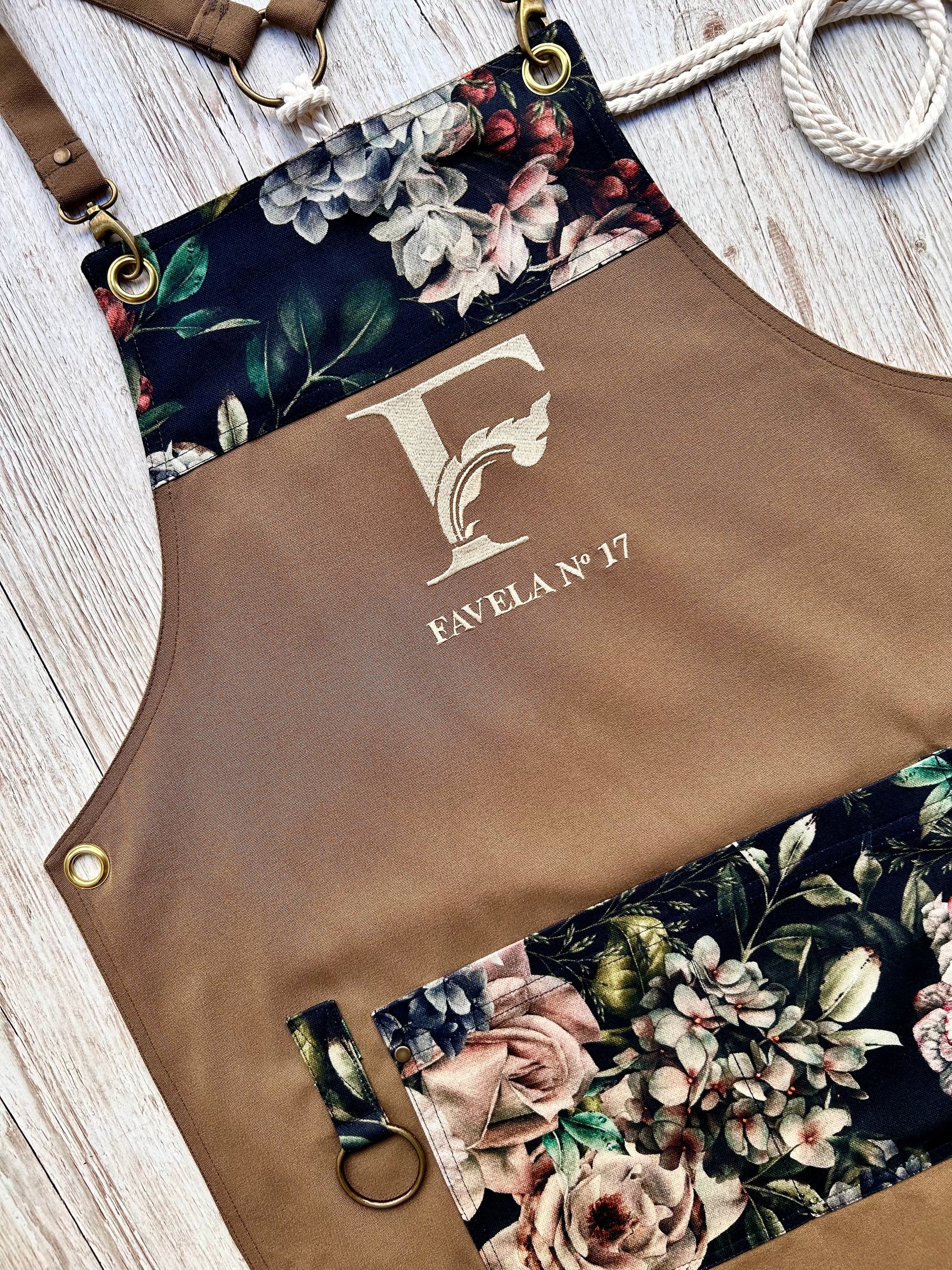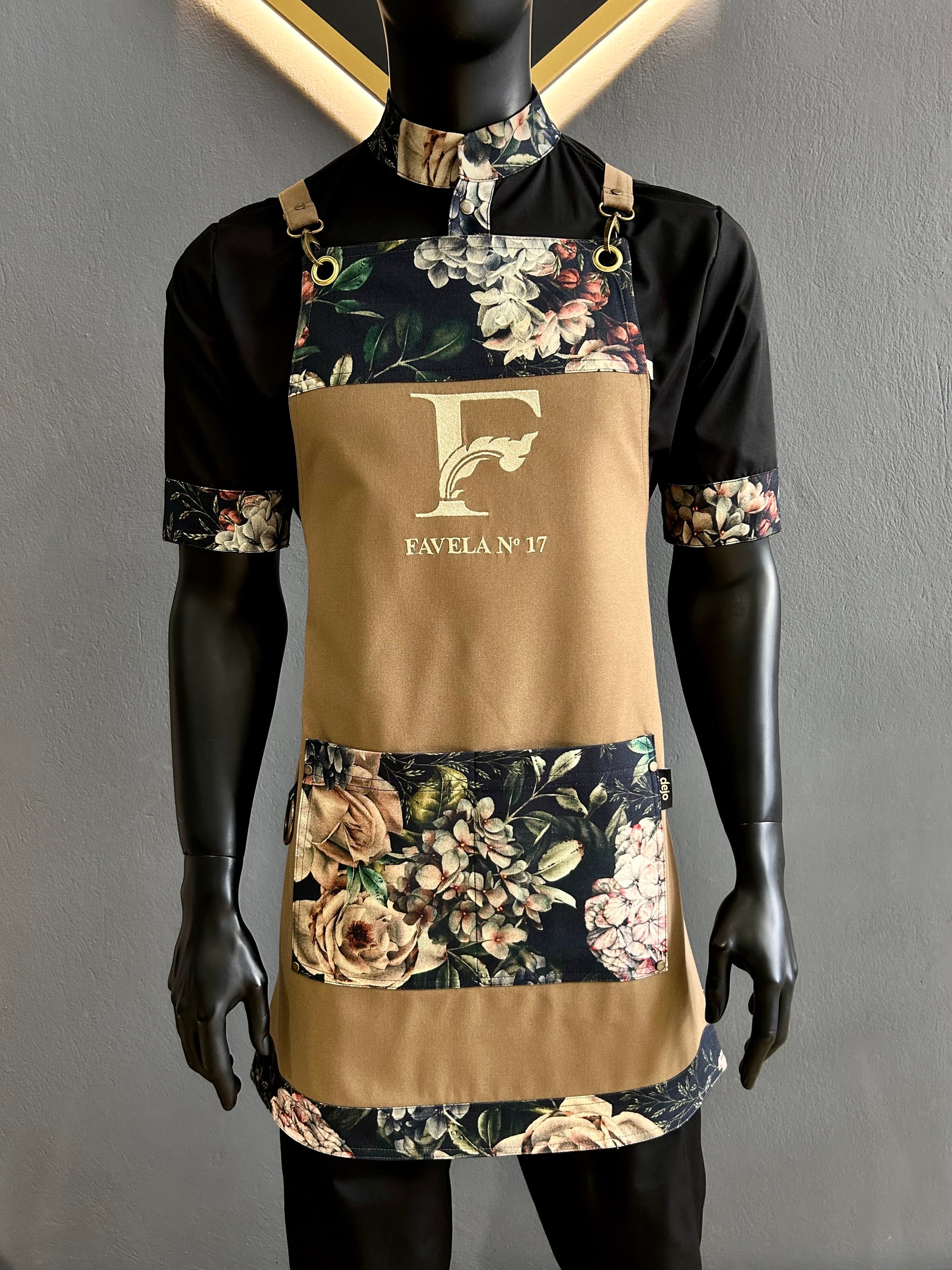Crafted from a strong waterproof beige fabric, it ensures durability and protection in daily professional use. The stain-resistant floral details add a romantic and refined touch, transforming this apron into a standout piece that blends practicality with artistic sophistication.